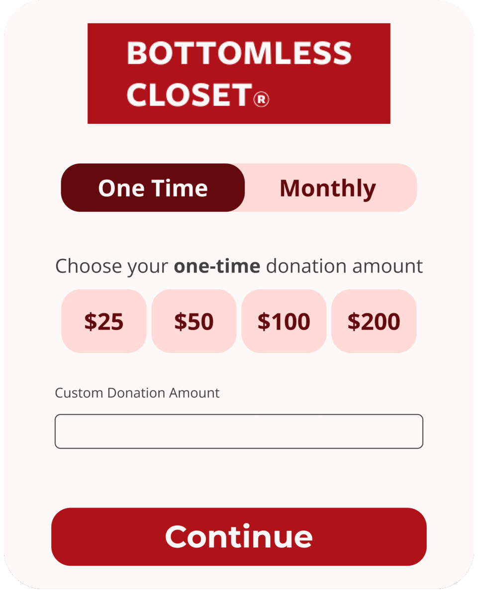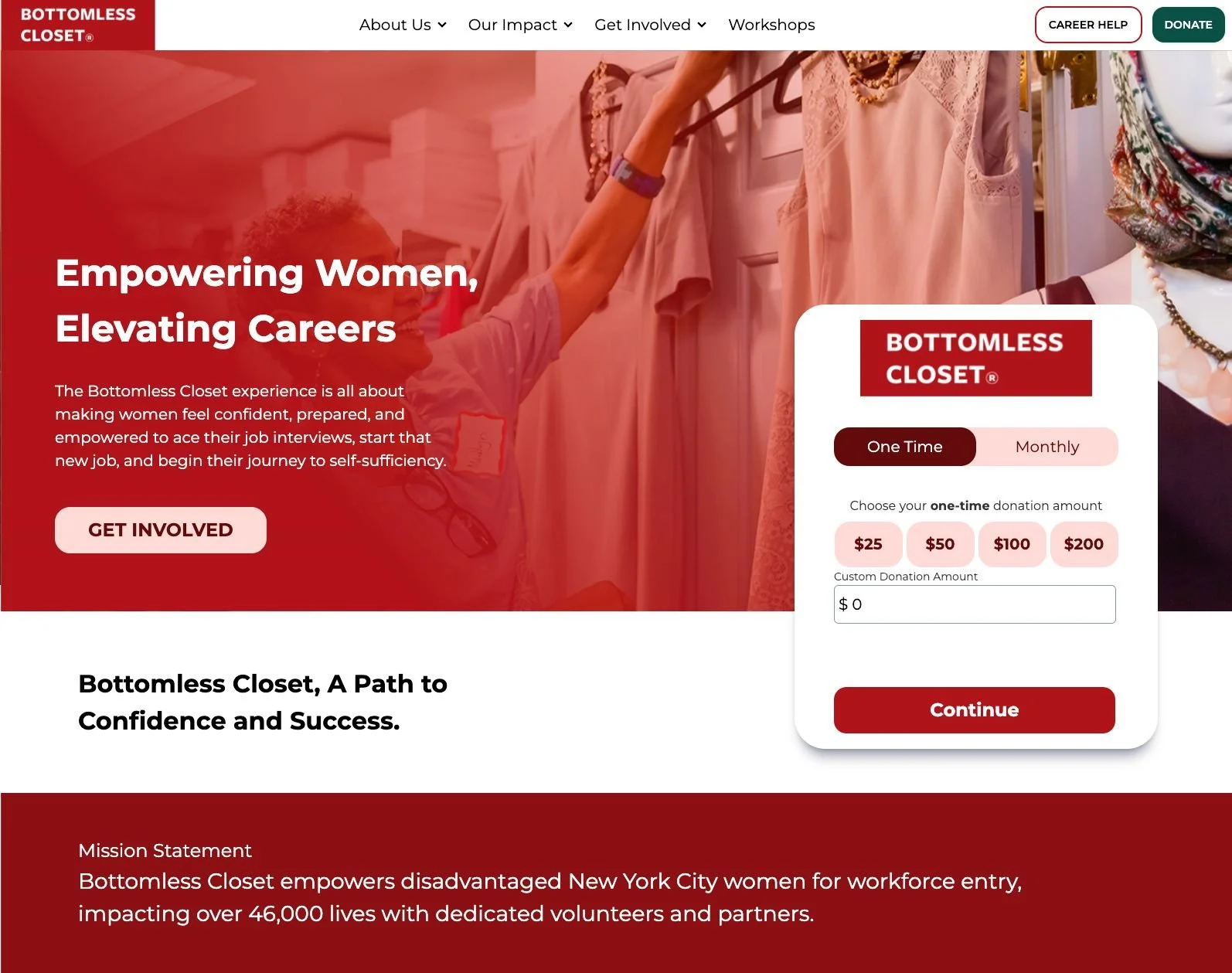 Improve the Bottomless Closet website by incorporating a clear mission on the homepage, optimizing the header, and simplifying page hierarchy. Improve 'Client Services' for clarity, enable seamless online onboarding and scheduling, and provide a convenient donation opportunity directly on the homepage.